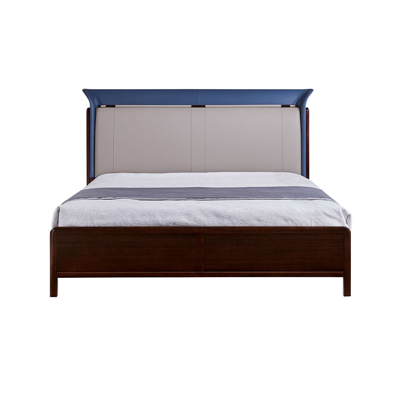 The Blue Amber Elegance Double Bed is a high-end bed that perfectly blends modern design with Eastern aesthetics. The headboard is made of blue and gray leather, inspired by the unique understanding of color in Eastern culture, symbolizing tranquility, depth, and wisdom. The dark brown wooden bed frame is sturdy and features smooth lines.